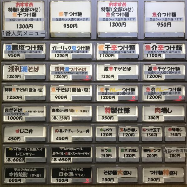 駅に直結したデパ地下でのテナント営業。平日は口頭注文、現金会計システムにて朝ラーメンがワンコインで提供。つけ麺、つけそばは麺大盛無料。インスタフォロワーは味玉サービス。店内はL字カウンター。訪問時、大きな入口に続々と会社帰りサラリーマン客が吸い込まれ常に満席状態。女性客も目立つ。