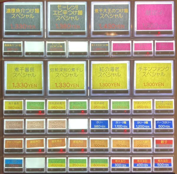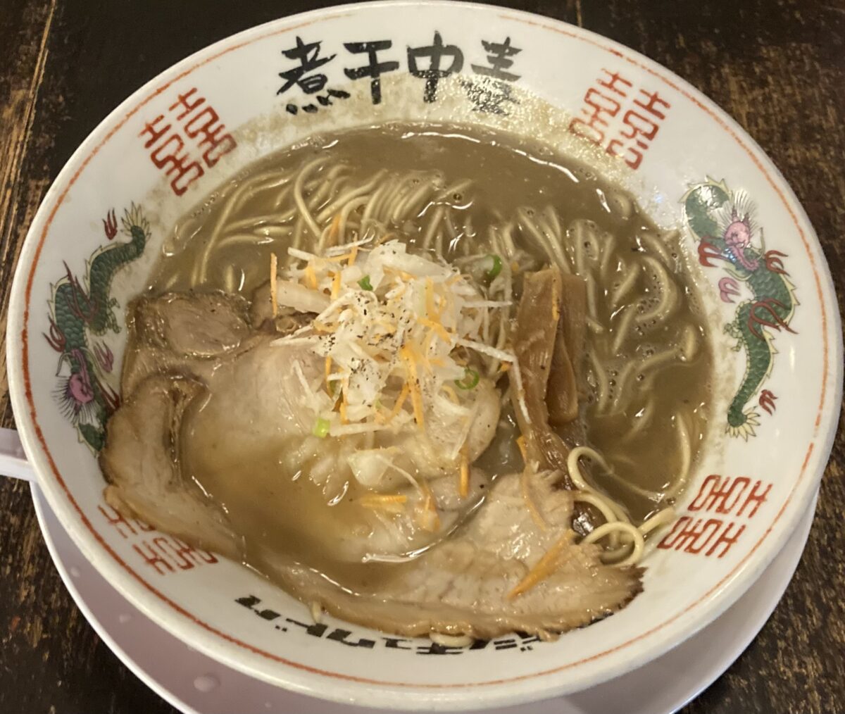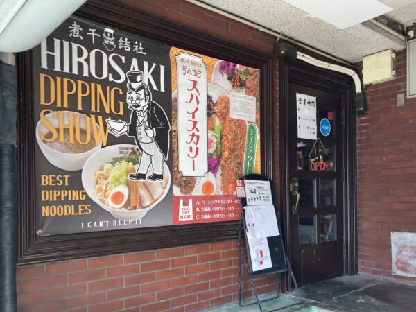 弘前市内で一番古い鉄筋コンクリートビルの1階(国の登録有形文化財)。煮干し専門店。限定も開催。カリーも大人気。店内は歴史を感じさせる雰囲気に昭和レトロなポスターなどが拍車をかける。中央のワゴンにある各種調味料やスープ割りなどセルフ。訪問時、3人の列に15分待ち。
