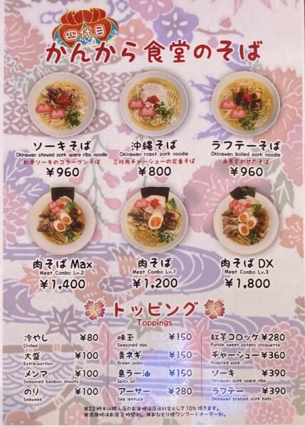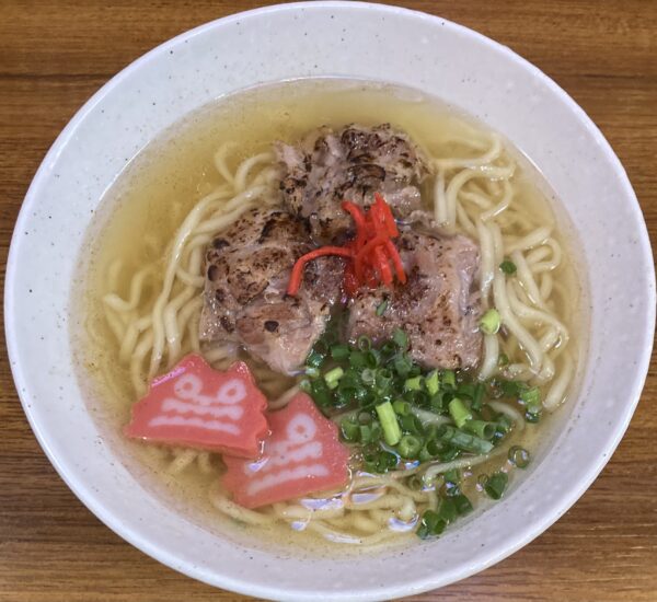スープは鰹の風味が香る〆ラーメンには脂くどくはいため背徳感のない、塩味が強くさっぱりしたキレのある口当たり。麺の腰の強さは格別で、独特の小麦粉の香りをふんだんに放ちながら、啜り後の余韻も残す。ソーキは芳ばしく焙られ、ビターな風味を演出。シーサーナルトが愛らしい。これだけで癒される。青ネギの緑に紅生姜の赤がナルトに華を添える。沖縄の本格ソウルフードを臨場感もって楽しめる一杯でした。