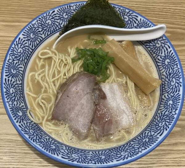 スープ;豚骨ベースに烏賊などの乾物魚介を合せ、醤油ダレで整えた無化調魚介豚骨スープ