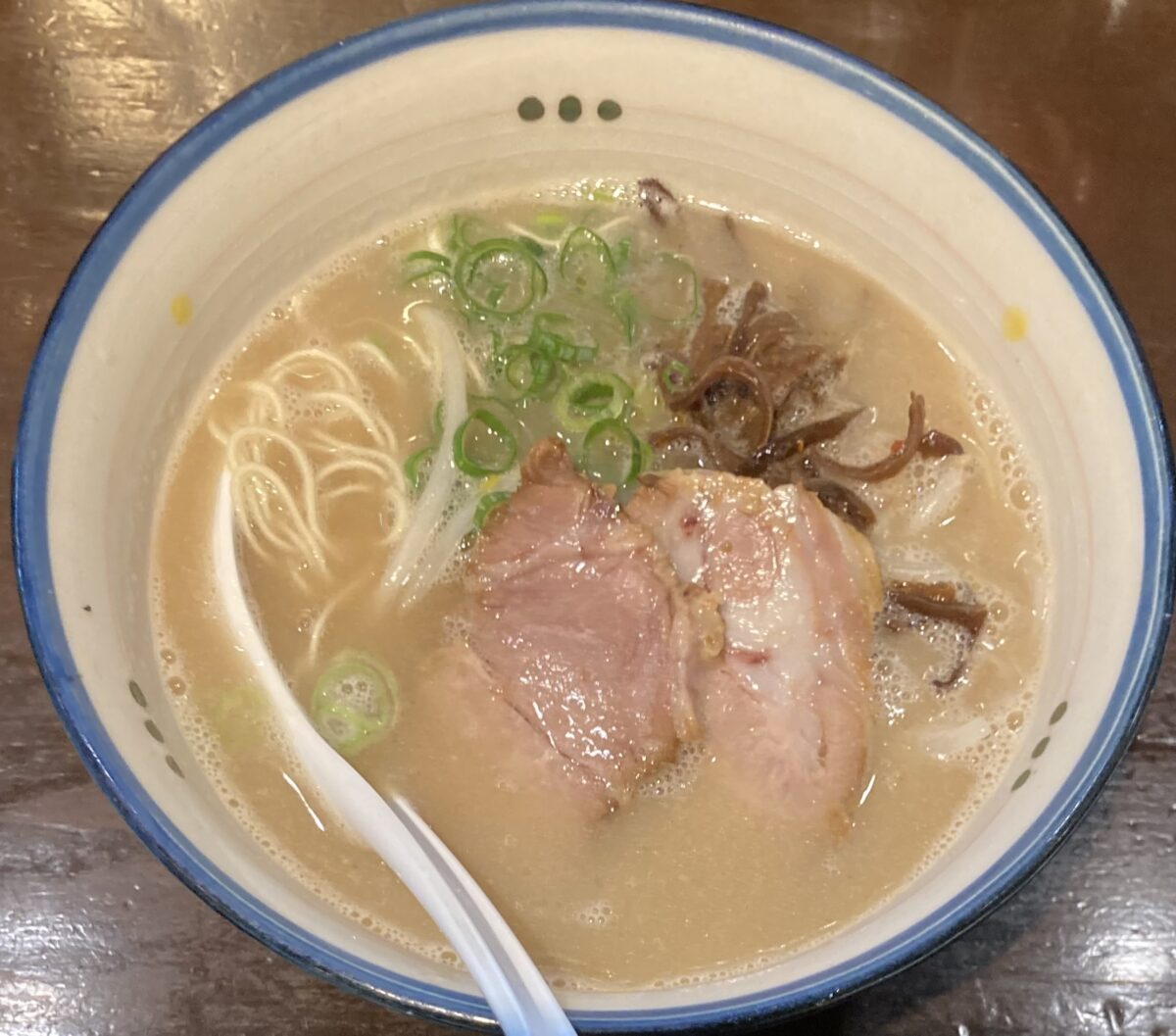 スープは獣臭が抑えられ、旨味が凝縮された濃厚でクリーミーな口当たり。麺はスープの旨味を吸収し、しなやかな麺線。芳ばしい小麦の香りを放ち、爽快な啜り心地。チャーシューは脂控えめのジューシーな豚肩ロース。コリコリキクラゲで繊維質を補給。しんなりもやしに、鮮やかな緑の九条ネギ。卓上には紅生姜、辛子高菜、ニンニクの豚骨三種の神器。折り紙付きの本格的豚骨が堪能できる一杯でした。