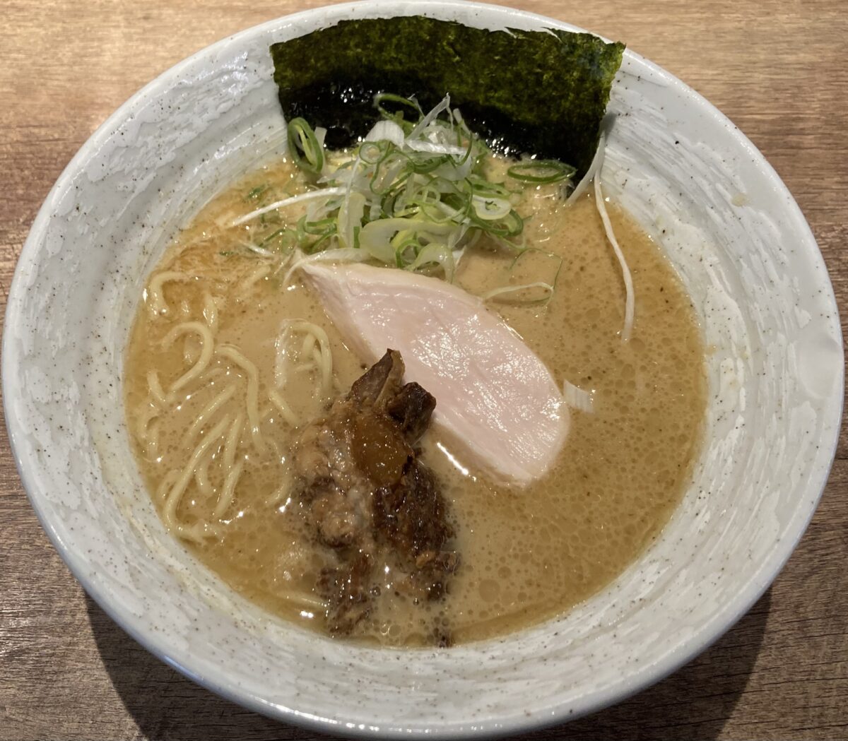スープは豚と鶏の黄金比率から成る濃厚乳化の円やかな口当たりに乾物系魚介のキレが冴えわたるトリプルスープ。麺は硬めの茹で加減。加水率低めのため、ボキボキ食感が印象的。チャーシューはさっぱりした鶏ムネの低温調理。コラーゲンたっぷり、味の染み入ったの豚軟骨。のりは磯の香り放つ膨潤タイプ。卓上辛にんにくで味変可。体に優しい濃厚無化調白湯に出会えた一杯でした。