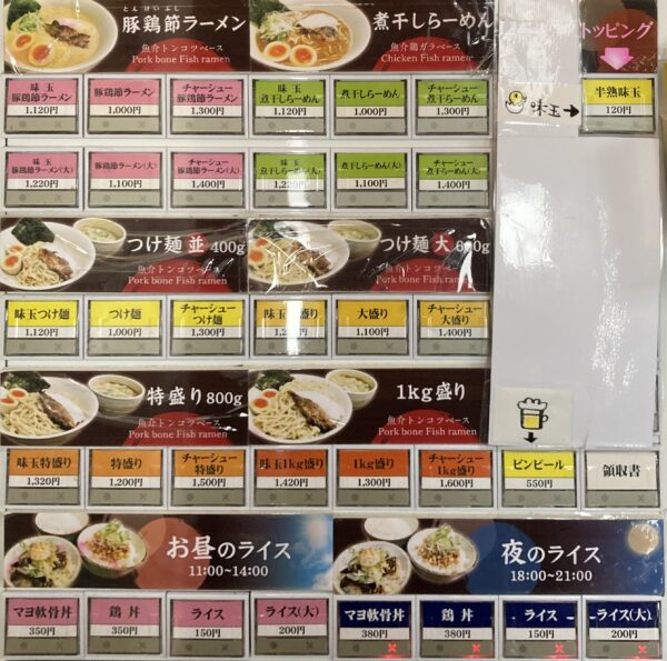 スープ:豚骨、鶏ガラなど圧力鍋で炊き上げ、多彩な乾物系魚介を併せた無化調白湯スープ