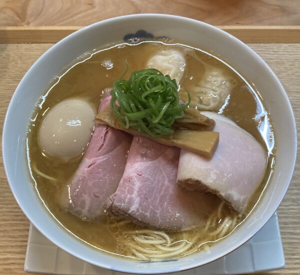 スープは丸鶏の円やかな口当たりに煮干しのキレと節系のコクがシナジー効果を発揮。麺は爽快な啜り心地にスープの旨味が寄り添う。チャーシューは脂身が抑えられた鮮やかなピンクの豚肩ロースとモモの低温調理。味玉の黄身は濃厚なオレンジ色のゲルタイプ。ワンタンの餡は豚肉とエビ。餡皮比は餡率高め。メンマのシコシコ食感が心地よい。創作ながら既に覚醒した完成度を持ち合わせる一杯でした。