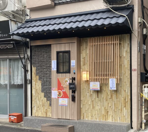 駅前の方南通り沿いに竹であしらわれた外観。創作による中華そばと担々麺の2本柱。店内は厨房を囲うカウンター席のみ。胡椒は電動ミル。布おしぼりが提供。寒い日にはカイロ提供、食後のお口直しなどホスピタリティ全開の接客。訪問時、平日昼時を外すも4人の列に20分待ち。