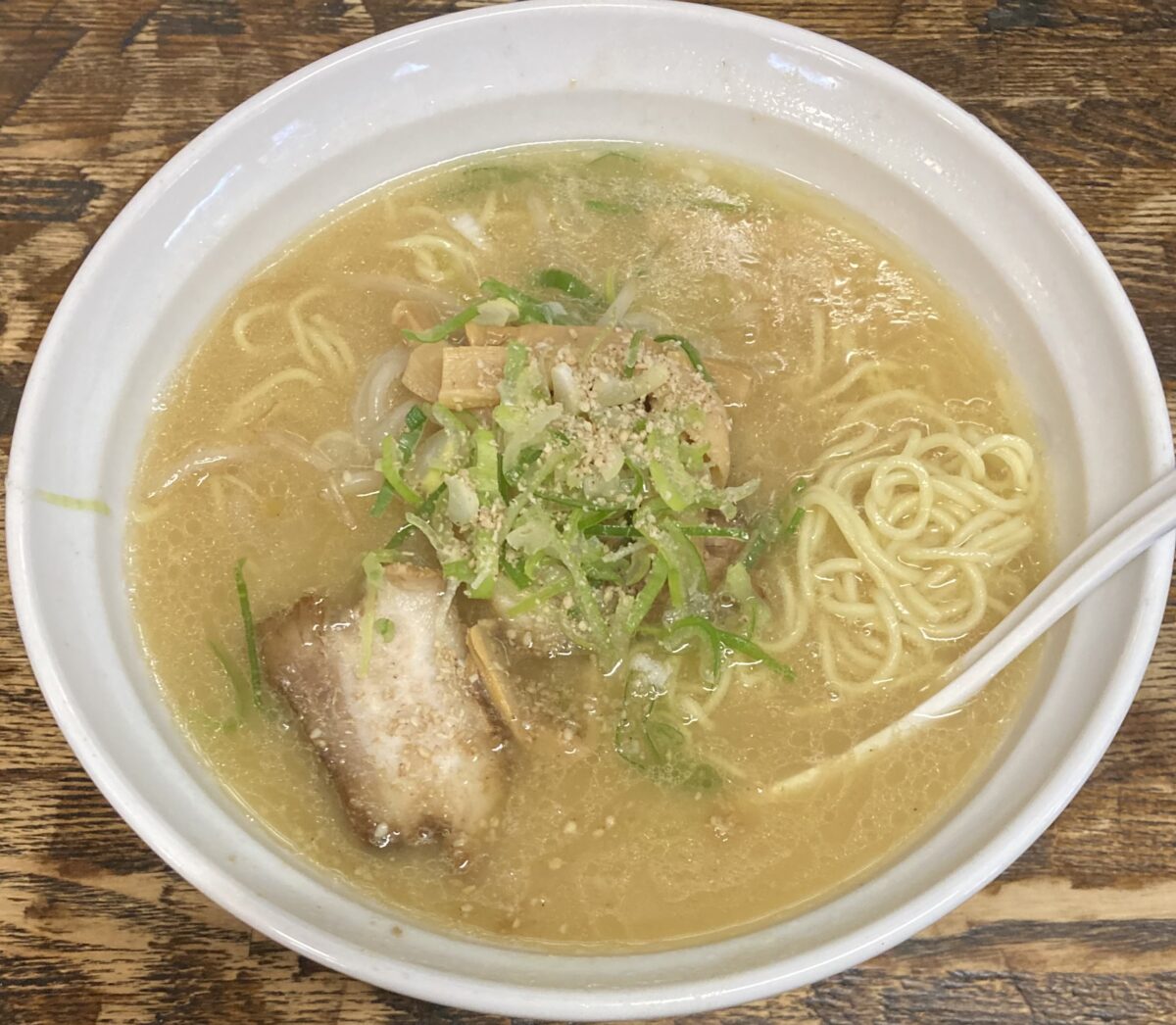 スープ:呼び戻しで炊き出された濃厚豚骨を塩ダレで整えた白濁スープ