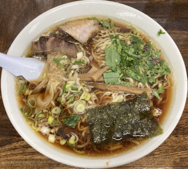 スープは鶏ガラの円やかなコクと香味野菜の豊潤な甘み。醤油のキレが冴えわたる。麺はザザッと豪快にワンパクな啜り心地が楽しめ、胃袋を圧倒するボリューム。チャーシューは豚バラの細切れ。麺の下にぎっしりと敷き詰められたワンタンの餡皮比は2対8。皮ののど越しが心地よい。海苔は磯の香り漂うドロドロ膨潤タイプ。望郷の念にかられるまさに憩いの一杯でした。