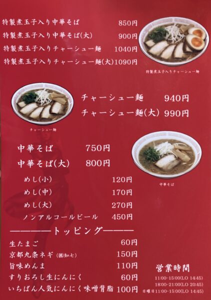 2005年創業。赤い暖簾が目印。不定期で暖簾が真っ白な煮食として限定煮干イベント。店内は清潔感のあるカウンター席とテーブル席。暖簾と同じ真っ赤なラミネートされたメニュー。通販での販売中。駐車場有り。口頭注文、食後現金会計システム。訪問時、常に満席状態。